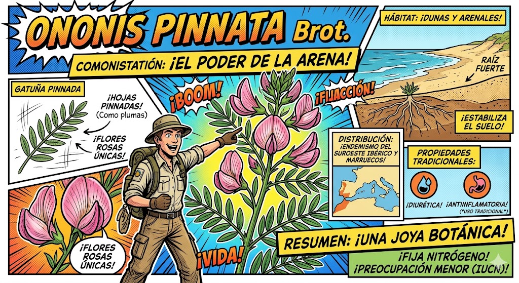 En resumen: Fue descubierta por Brotero en los arenales del centro de Portugal a finales del siglo XVIII y presentada al mundo científico en 1804, siendo hoy reconocida no solo como una joya botánica de la Península, sino como un «fósil viviente» del género Ononis.