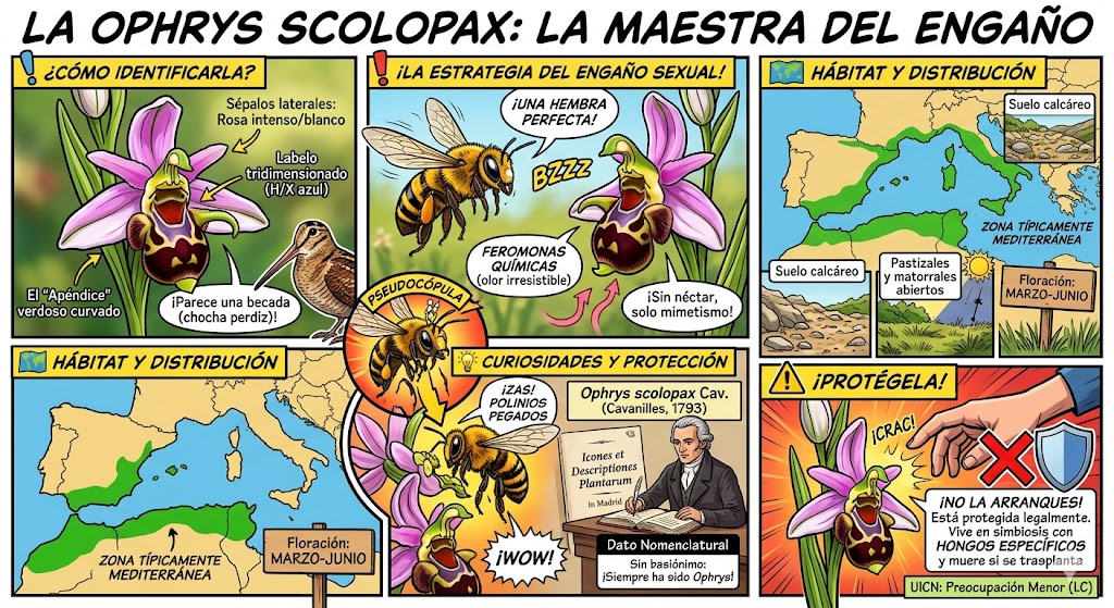 La Ophrys scolopax Cav. es un ejemplo magistral de evolución biológica. Sus adaptaciones no son solo físicas, sino que implican una compleja ingeniería química y biológica diseñada para sobrevivir en el ambiente mediterráneo y asegurar su reproducción sin ofrecer recompensas típicas (como el néctar).