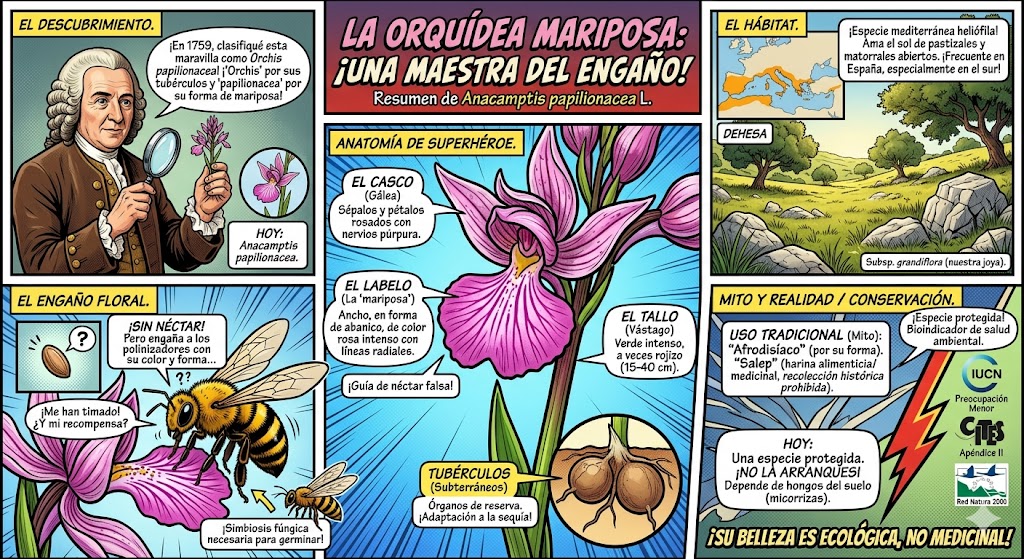 Dato importante: La IUCN enfatiza que las orquídeas son «plantas bandera». Si una población de Orchis papilionacea desaparece, suele ser un indicador temprano de que el ecosistema de polinizadores e insectos del suelo está colapsando.