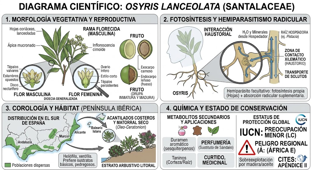 Al igual que otros miembros de la familia del sándalo, Osyris lanceolata es una planta hemiparásita radicular. Esto significa que, aunque puede realizar la fotosíntesis, obtiene agua y nutrientes minerales de las raíces de otras plantas hospedadoras mediante órganos especializados llamados haustorios.