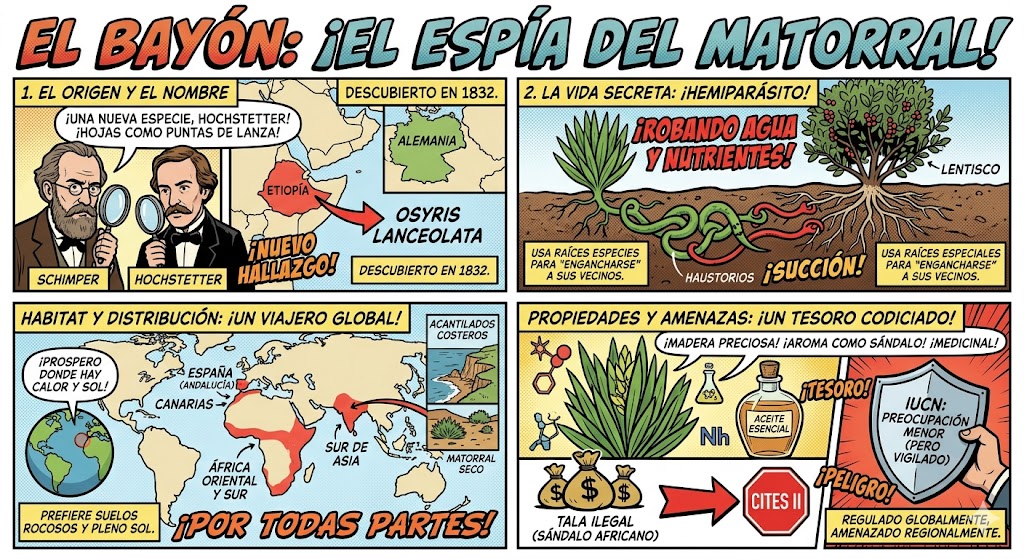 En Andalucía, Osyris lanceolata (conocido popularmente como bayón) se distribuye de forma casi exclusiva por la franja litoral y los valles cálidos del interior, evitando las zonas de montaña con heladas frecuentes. Su presencia es un indicativo de climas con influencia marítima y temperaturas suaves.