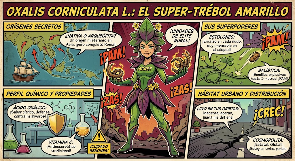 La supervivencia y el éxito global de Oxalis corniculata L. no son casualidad; esta planta es una «ingeniera» de la adaptación. Ha desarrollado mecanismos específicos para colonizar entornos difíciles, resistir el mantenimiento humano y asegurar su descendencia.