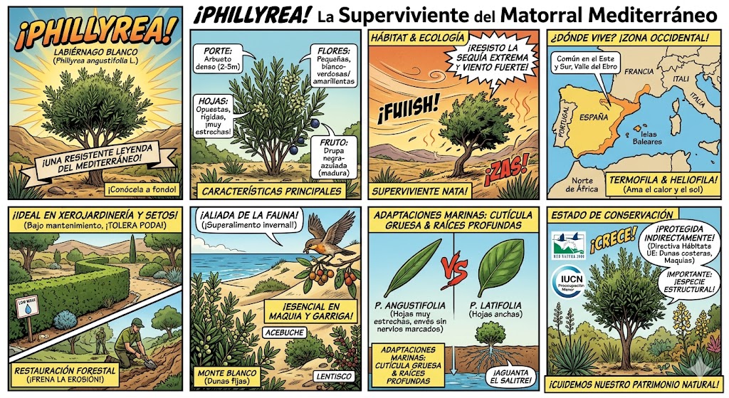 La Phillyrea angustifolia L., conocida comúnmente como labiérnago blanco o olivo silvestre de hoja estrecha, es una de las especies más representativas del matorral mediterráneo. Es un arbusto robusto, perennifolio y extremadamente resistente, muy valorado tanto en restauración ecológica como en jardinería sostenible.