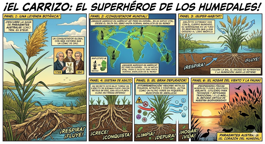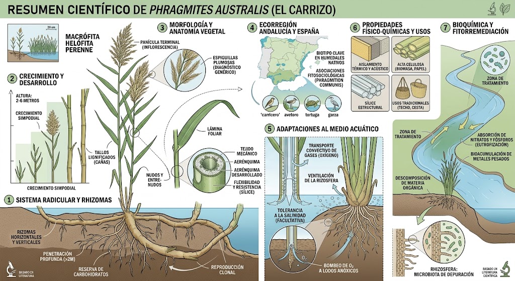 Conocida comúnmente como carrizo, esta es una de las plantas vasculares con una de las distribuciones geográficas más amplias del mundo. Es una especie perenne, robusta y colonial que domina ecosistemas de humedales.