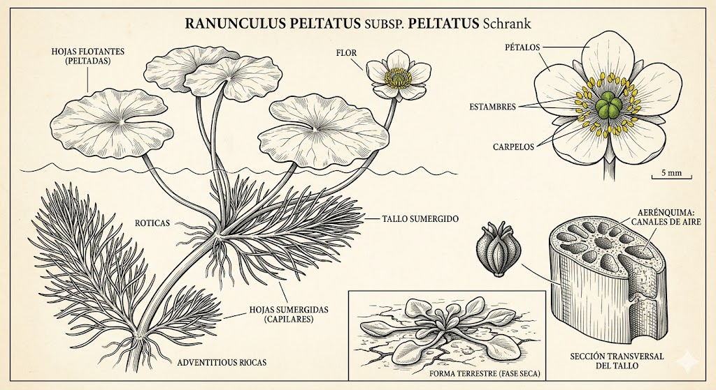 El Ranunculus peltatus es un verdadero maestro de la supervivencia. Su mayor éxito evolutivo es la plasticidad fenotípica, lo que significa que la planta puede cambiar su forma física drásticamente según si el nivel del agua sube, baja o desaparece.