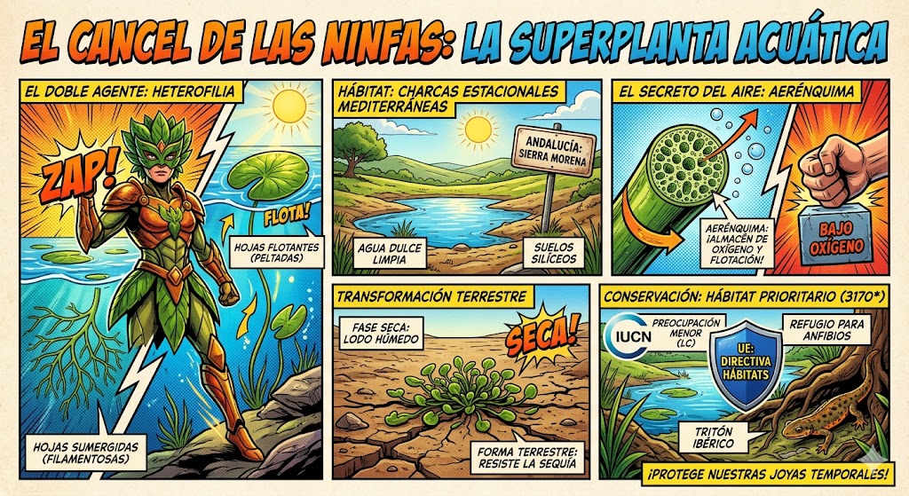 Resumen: Si ves un Ranunculus peltatus en una charca de Sierra Morena, estás ante una planta legalmente «segura», pero que vive en un hogar (la charca temporal) que es una joya de conservación prioritaria en toda Europa.