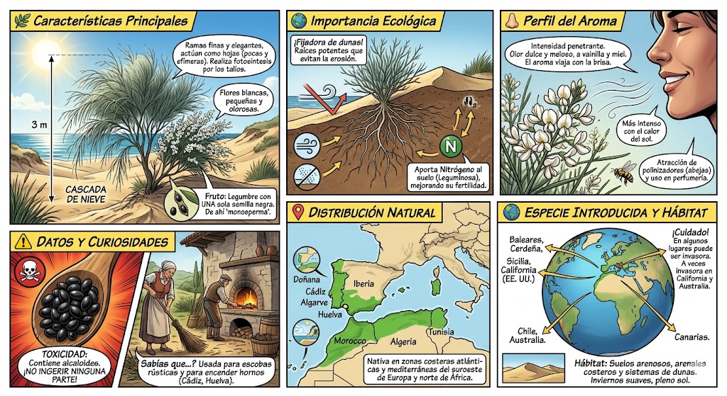 | Característica | Retama Blanca (R. monosperma) | Otras plantas de duna (p. ej. Barrón) |