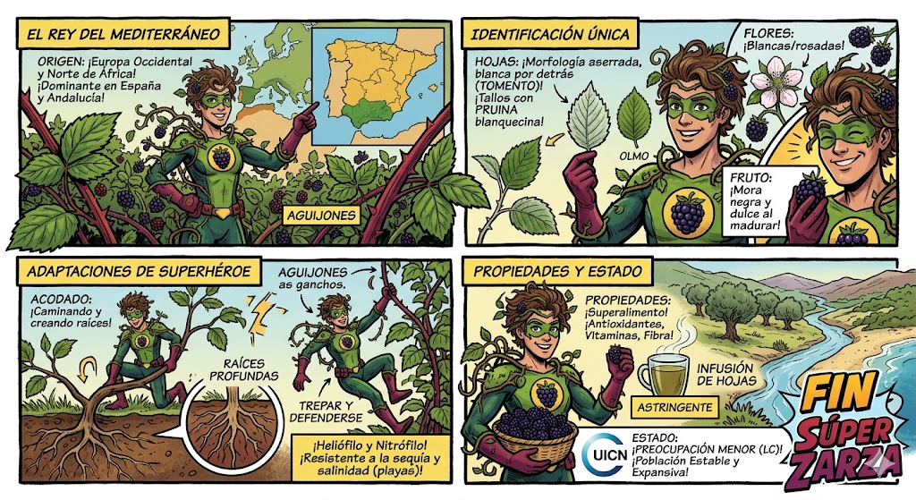 Nota de observación: Si te encuentras en un zarzal andaluz en pleno agosto, verás que es uno de los pocos lugares que mantiene un verde intenso mientras el resto del paisaje está agostado (amarillo). Esto se debe a sus raíces, que pueden alcanzar varios metros de profundidad para buscar la humedad que el sol andaluz evapora de la superficie.