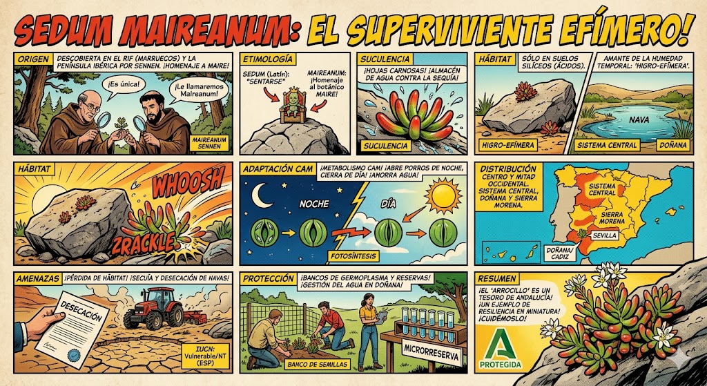 Bioindicadora: Su presencia es una señal inequívoca de suelos silíceos y de la existencia de humedad temporal. Si el Sedum maireanum desaparece de una zona, suele indicar que el acuífero se está secando o que el suelo se está contaminando.