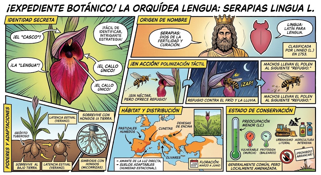 Razón descriptiva: Es una alusión directa a la forma del labelo de la flor. A diferencia de otras especies del género que tienen el labelo más ancho o acorazonado, el de la Serapias lingua es estrecho, alargado y suele colgar hacia abajo, guardando un parecido asombroso con una lengua humana o animal.