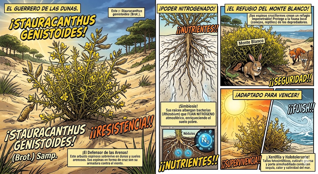 Para sobrevivir en uno de los entornos más hostiles de la Península Ibérica (las dunas de arena con influencia atlántica), Stauracanthus genistoides ha evolucionado hasta convertirse en una «máquina de resistencia». Sus adaptaciones son un ejemplo perfecto de ingeniería biológica para combatir la sequía, el viento y la falta de nutrientes.