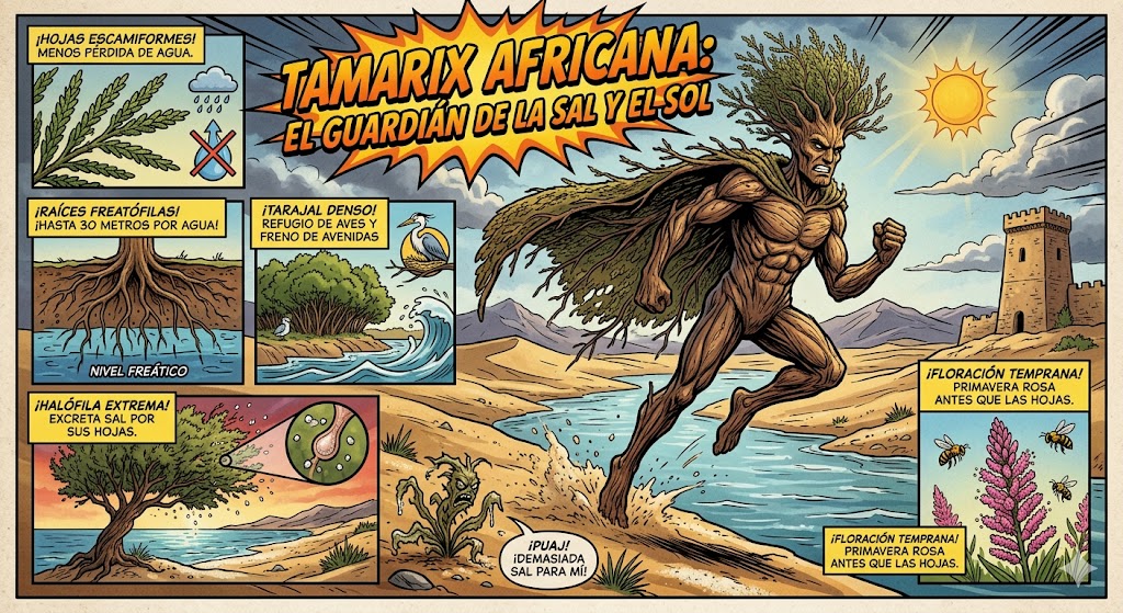 El Tamarix africana es una auténtica «máquina de supervivencia». Sus adaptaciones no son solo rasgos físicos, sino estrategias evolutivas extremas para colonizar ambientes donde la mayoría de los árboles morirían en cuestión de días (salinidad alta, sequía prolongada e inundaciones repentinas).