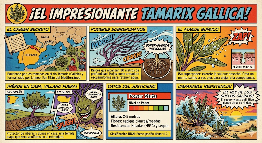 El Tamarix gallica es un prodigio de la ingeniería natural. Sus adaptaciones no son solo para sobrevivir, sino para dominar entornos hostiles donde hay exceso de sal, vientos violentos y ciclos de inundación o sequía extrema.