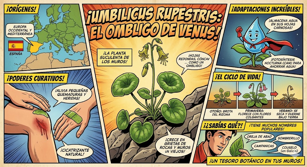 Es un nombre muy coherente: si ves una hoja con forma de ombligo creciendo en una pared de piedra, casi con seguridad estás ante una Umbilicus rupestris.